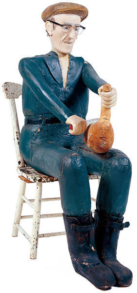 Collins Eisenhauer was a Nova Scotian folk artist born in Lunenburg County in 1898. As a child he had a love of art and made drawings and paintings. His father would sell postcards of drawings made by young Collins. Out of necessity, he left school at thirteen and went to work, leaving art behind. When he retired in the nineteen sixties, he decided to spend his remaining years making art. He felt that at sixty-six, he was too old to paint so he began carving wood. He made carvings of people and animals that he painted so that they could withstand the elements. His yard was his gallery, and his friends and neighbours were his audience. A passing antique dealer saw Eisenhauer’s work in the early 1970s and his career as a professional artist began.