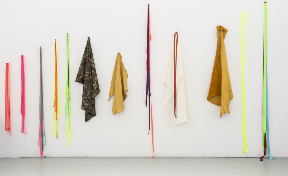 Featured Image: Meagan Musseau, Material Harvesting, 2018. Fabric, leather, and ribbon. Installation documentation during the Emerging Atlantic Artist residency at Banff Centre for Arts and Creativity.