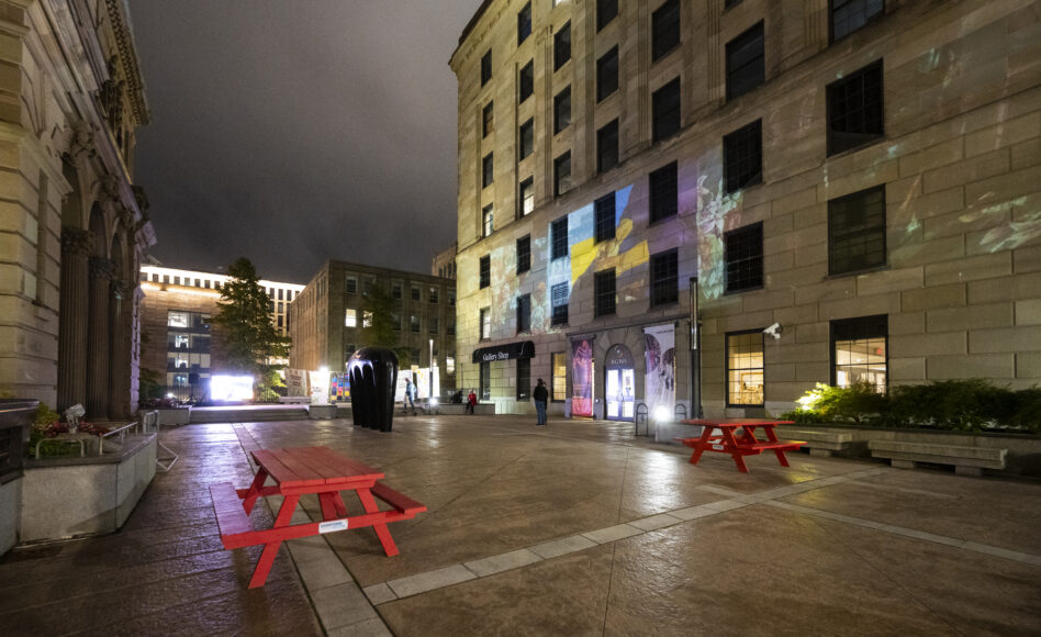 Mi’kmaw Quill Artist from Abegweit First Nation, located in Epekwitk (PEI), Melissa Peter Paul ignites/mobilizes Mi’kmaw worldview by overlaying urban spaces such as the courtyard with Mi’kmaw quillwork designs.