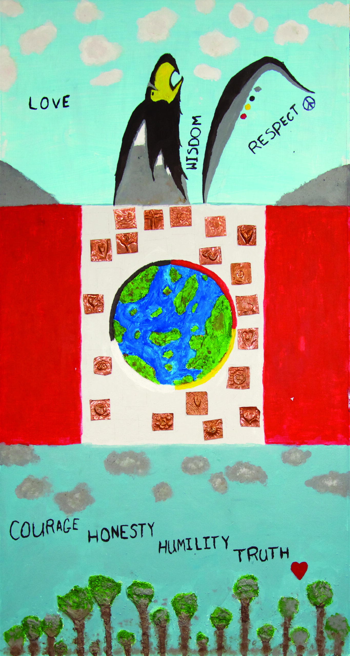 For this project, local visual artist Kate Adams guided Elizabeth Lalonde and her Grade 8 students through an in-depth study of Dene Suline artist Alex Janvier’s monumental artwork, Morning Star. The students also studied the Seven Sacred Teachings, a set of teachings on human conduct towards others. Many Indigenous groups follow their guidance.