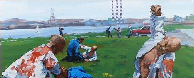 Halifax artist Mathew Reichertz was the 2006 Atlantic Canada nominee for the Sobey Art Award. This past fall the 2006 Sobey Art Award Exhibition, presented by Scotiabank, was mounted at the Montreal Museum of Fine Arts. On view for the first time there was Reichertz’s ambitious new work The Fight. This series of seven large paintings continues Reichertz’s interest in the investigation of time and narrative. The source material for The Fight were a series of photographs featuring Reichertz and a friend engaging in an ongoing, mock battle, using various Halfiax locations as the setting for their conflict. Each of the seven painting features several different scenes, quoting both film and early Renaissance painting in his use of multiple scenes, depicting the passage of time, within the same “frame.”