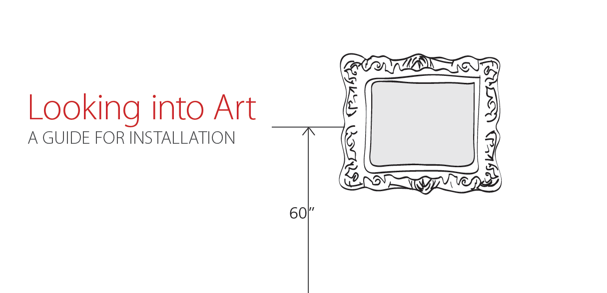 To determine where the hooks should be placed, measure the height of the painting and divide in half to determine the center point; if the painting is 48” tall, this would mean the center is at 24”. Now you need to take into account the placement of the wire, so measure from the wire up to the top of the frame (let us assume this is 10”.). Since the center of the work to the top of the frame measures 24”, and the wire is hanging 10” below the top of the frame, there is 14” from the center point of the painting to the wire (24” – 10” = 14”.) Add the distance from the center of the painting to the hanging wire (in this case 14”) to the 60” to determine the placement of the picture hangers. So if we place the bottom of the picture hanging hooks at 74”, the center of the painting will hang at 60”.